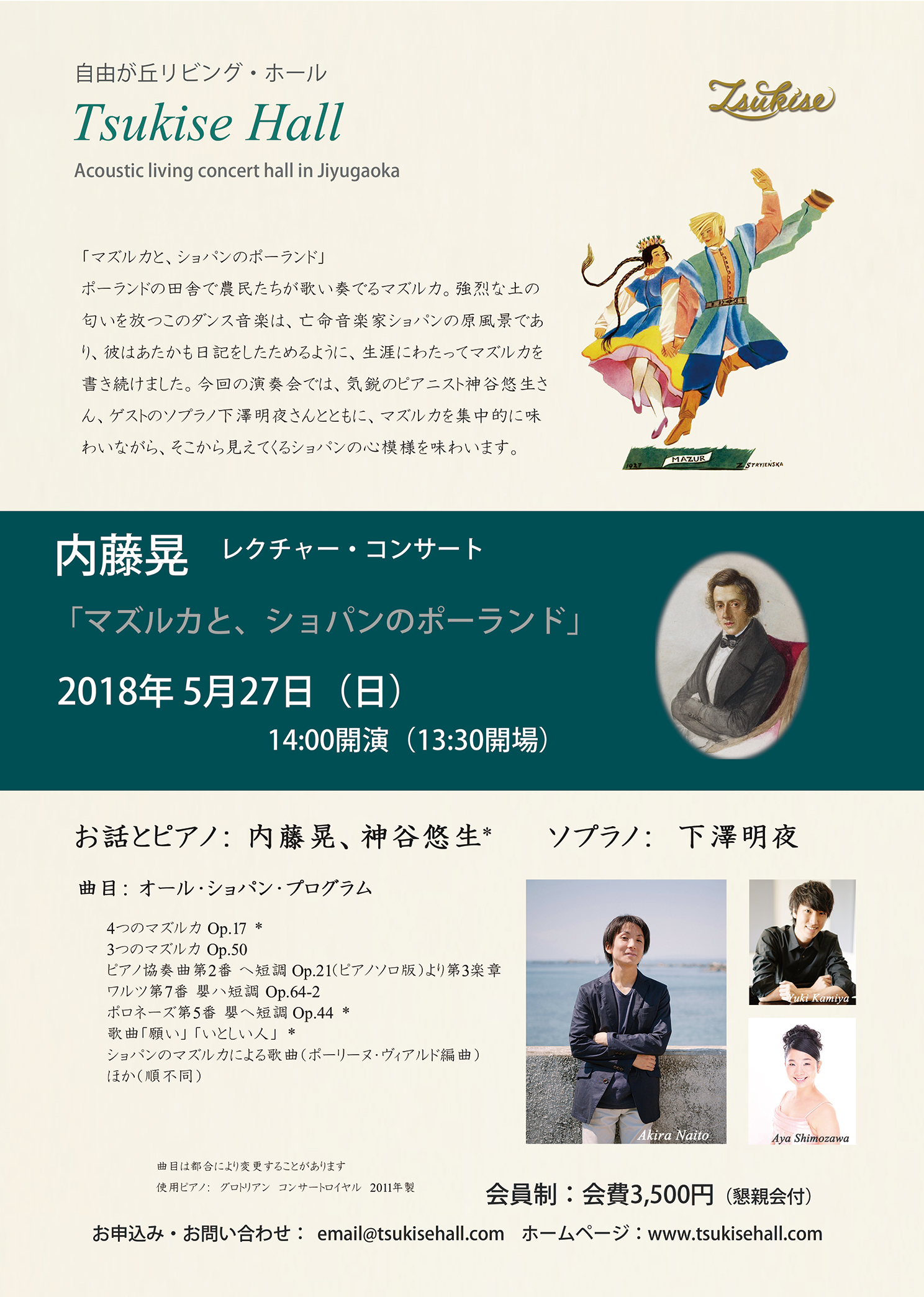 月瀬ホールではお馴染み、気鋭のピアニスト・指揮者の内藤晃が、若手ピアニストの神谷悠生と共に、マズルカとショパンについて語ります。ゲストはソプラノの下澤明夜です。