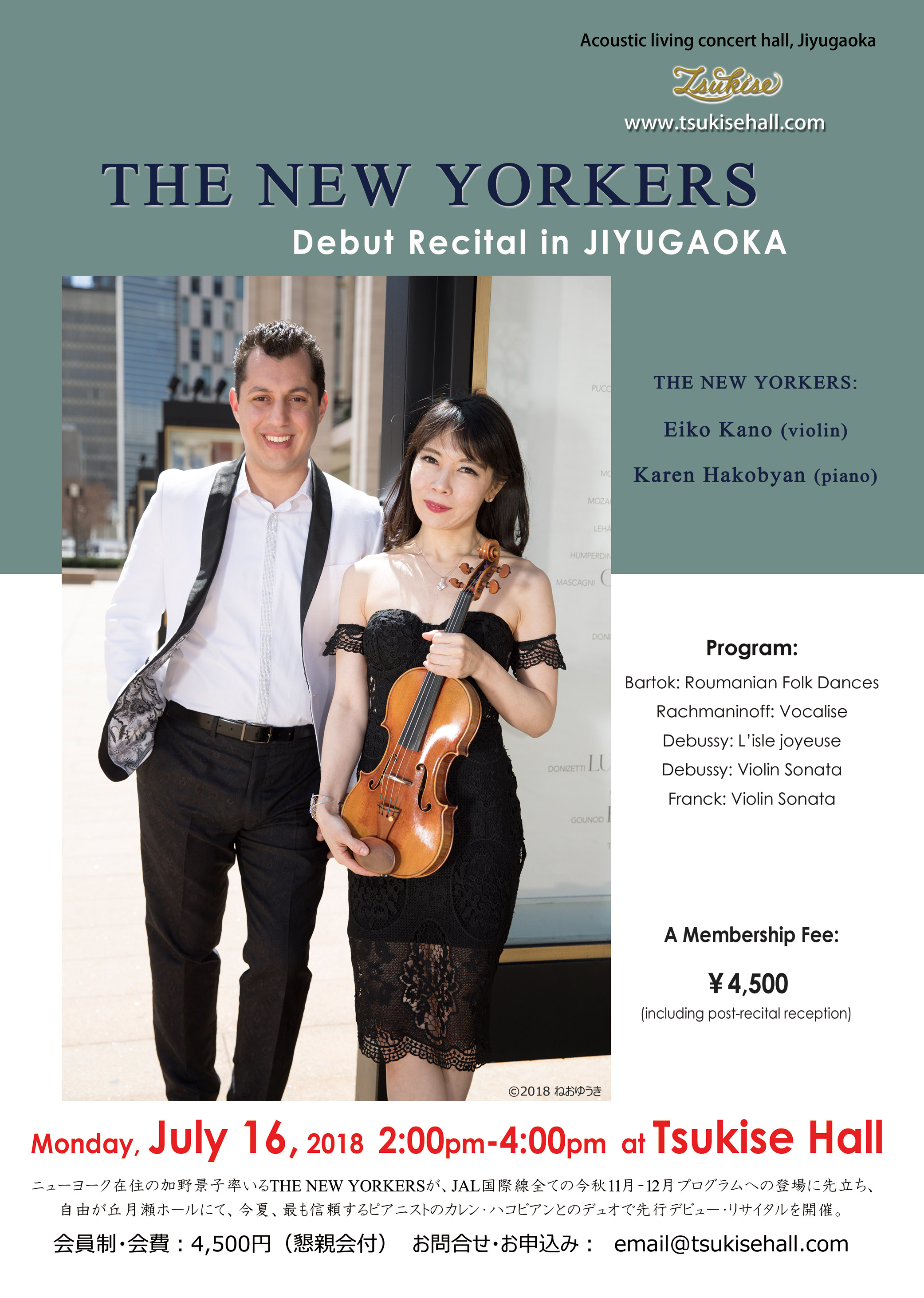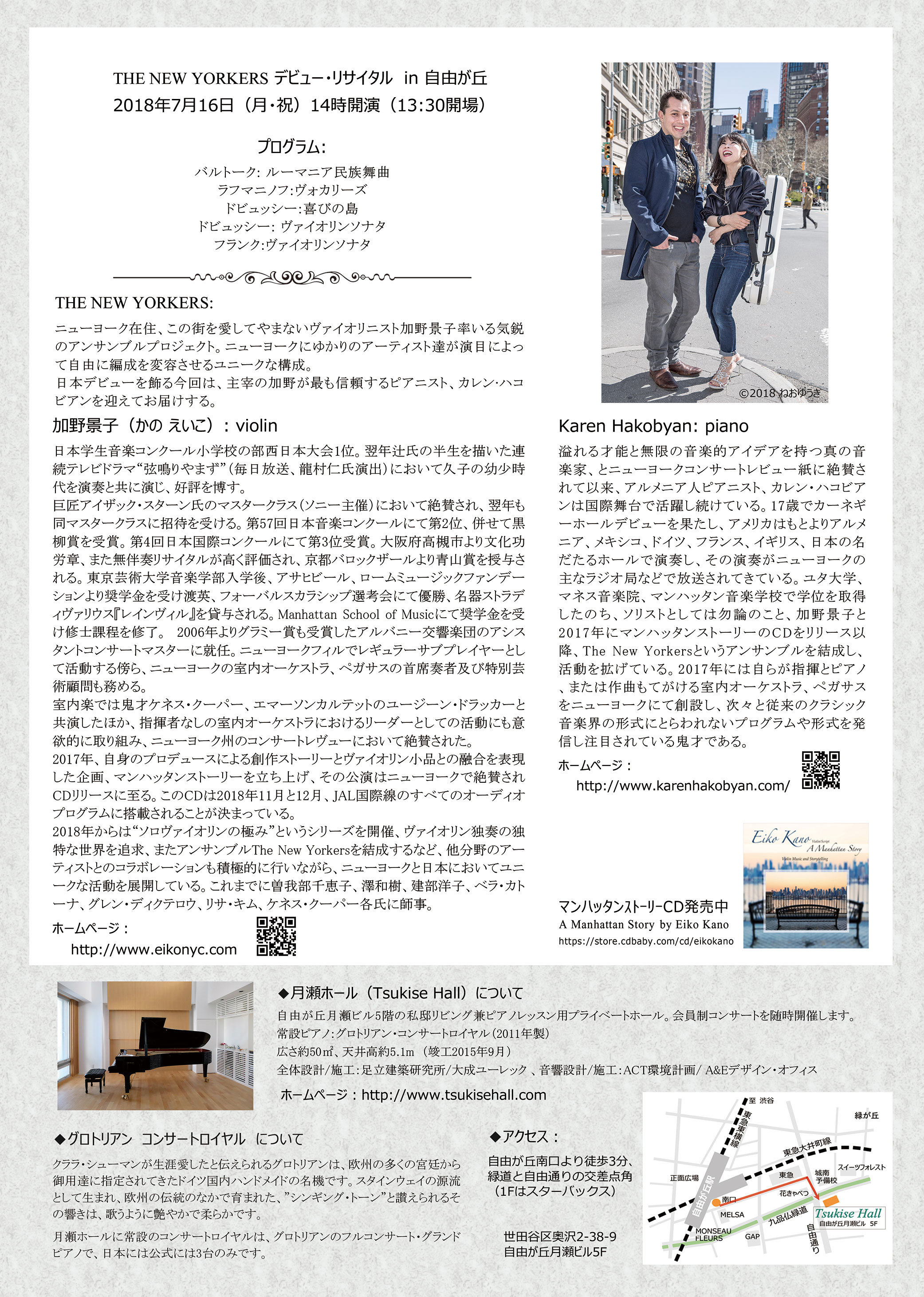 ニューヨーク在住の加野景子率いるTHE NEW YORKERSが、JAL国際線全ての今秋11月-12月プログラムへの登場に先立ち、今夏、自由が丘月瀬ホールにて、最も信頼するピアニストのカレン・ハコビアンとのデュオで先行デビュー・リサイタルを開催します。