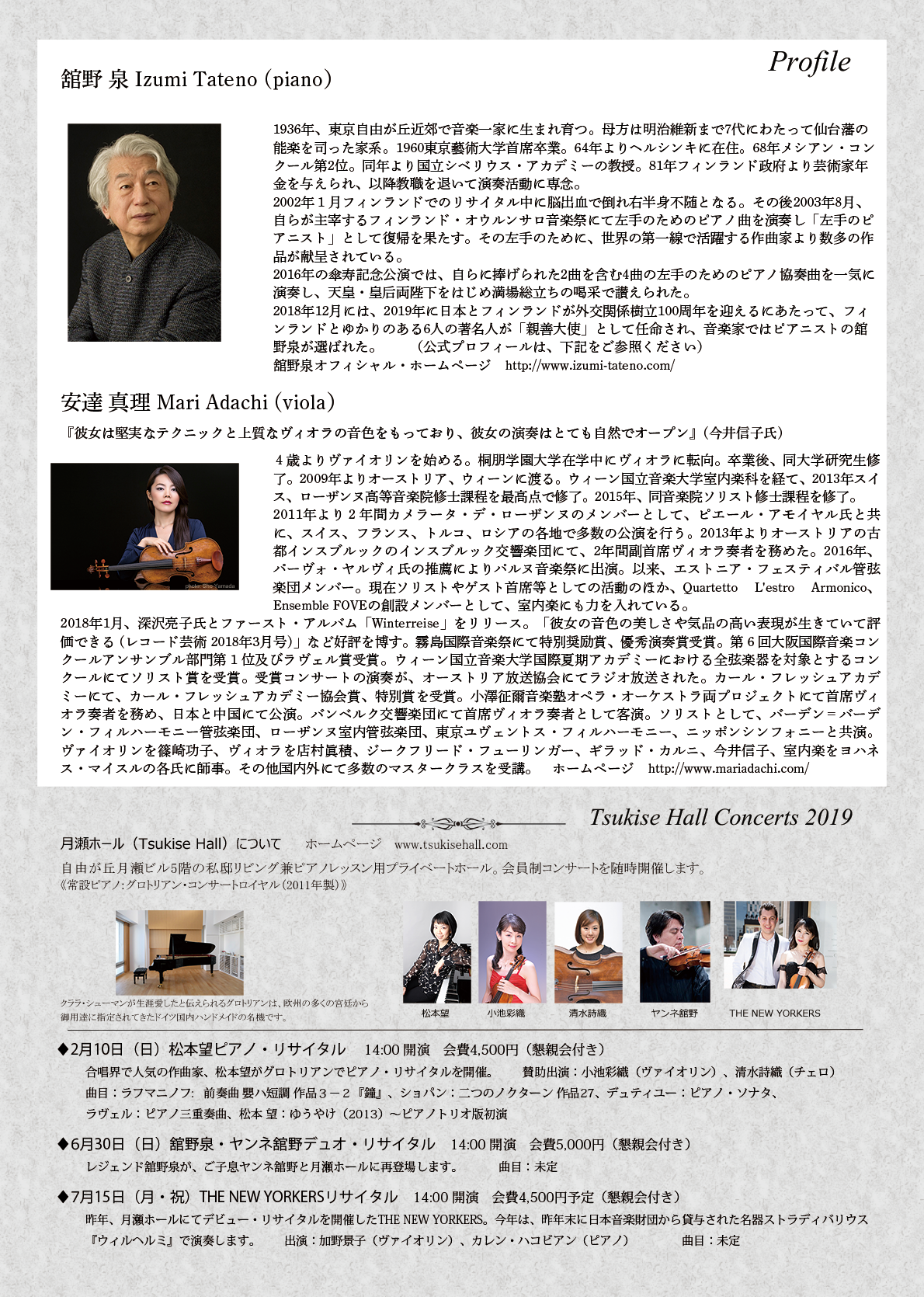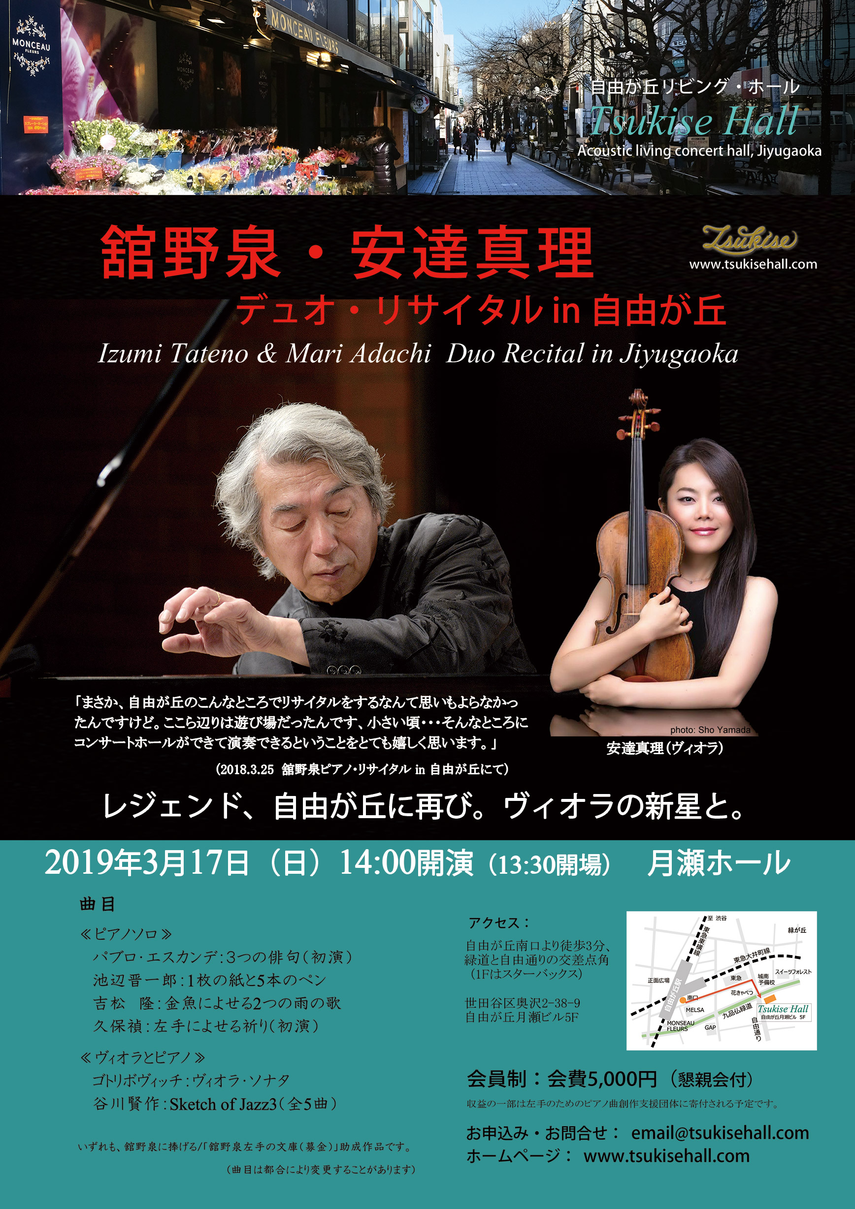 月瀬ホール2019年3月は、昨年、自由が丘で初のリサイタルを開催されたクラシック界のレジェンド、舘野泉さんが再び登場します。共演は、今注目のヴィオラの新星、安達真理さんです。