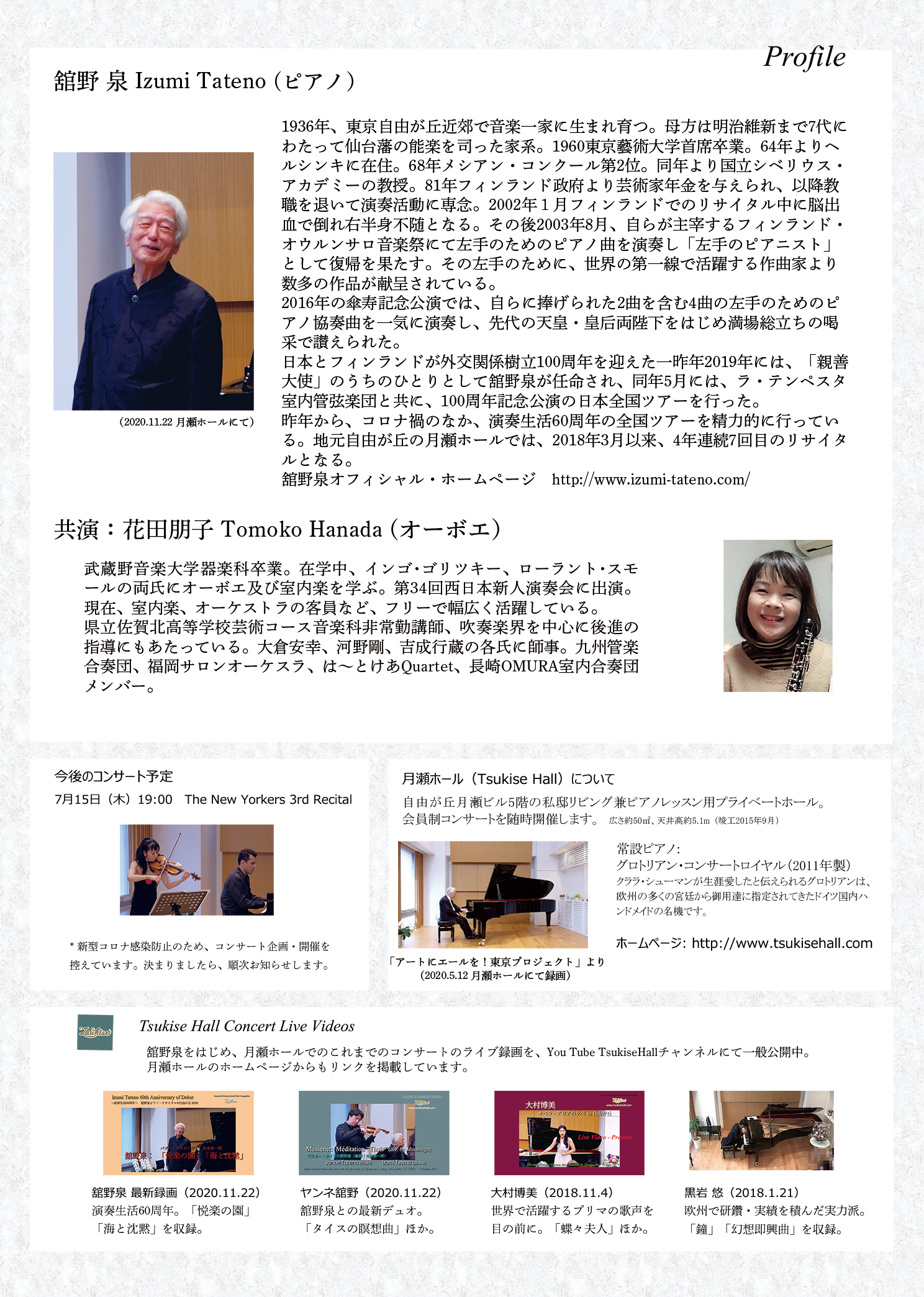 今回の共演は、気心の知れたオーボエの花田朋子さんです。新型コロナ感染防止対策のため、席数を約半数に制限しします。