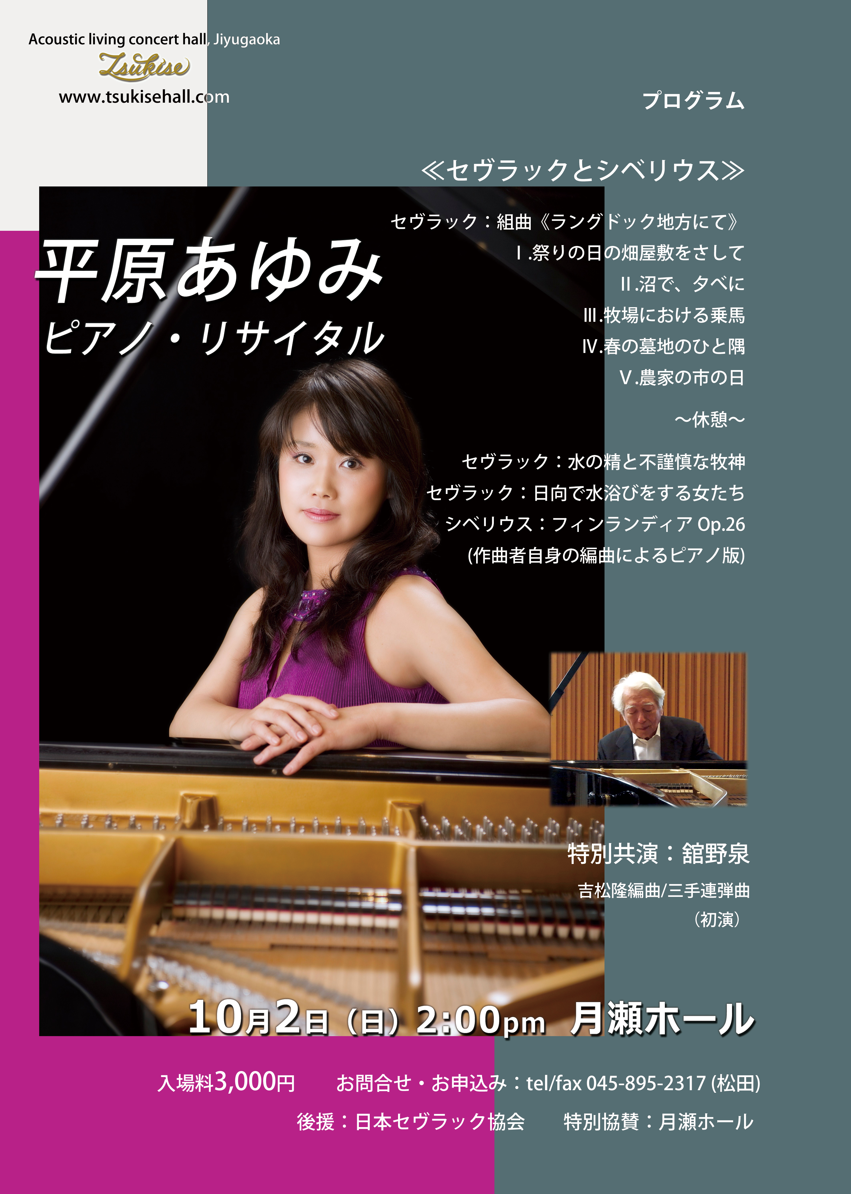 セヴラック生誕150周年記念の今年、日本セヴラック協会顧問・舘野泉の唯一の弟子である平原あゆみが、月瀬ホールでリサイタルを開催します。