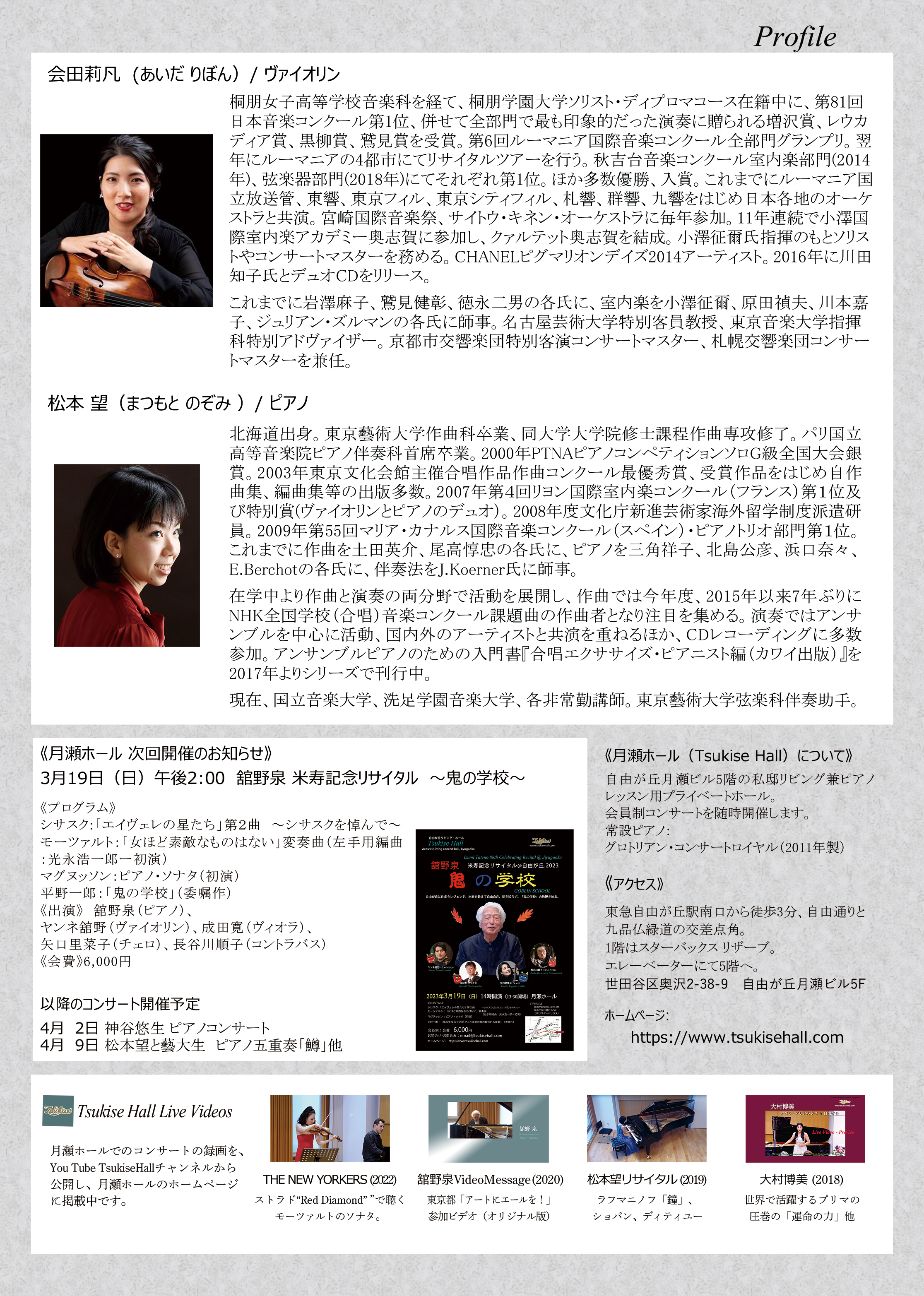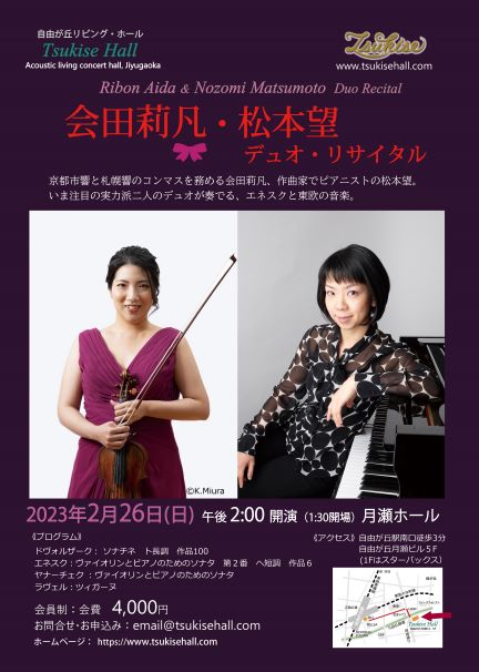 《会費》3,000円(学生2,000円) 《出演》 松本望(ピアノ)、菊川穂乃佳(ヴァイオリン)、