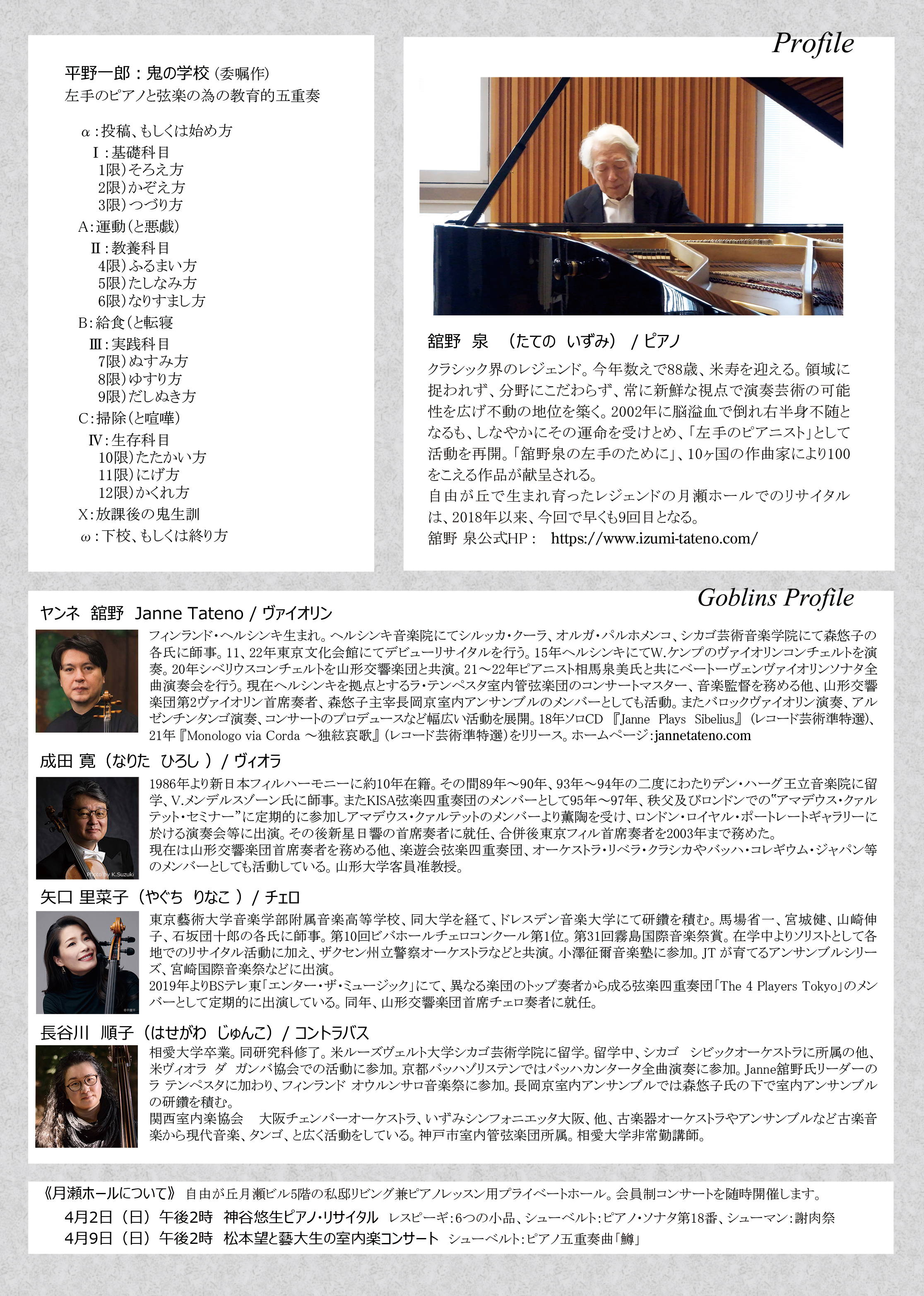 平野一郎:「鬼の学校 左手のピアノと弦楽の為の教育的五重奏」(委嘱作)
