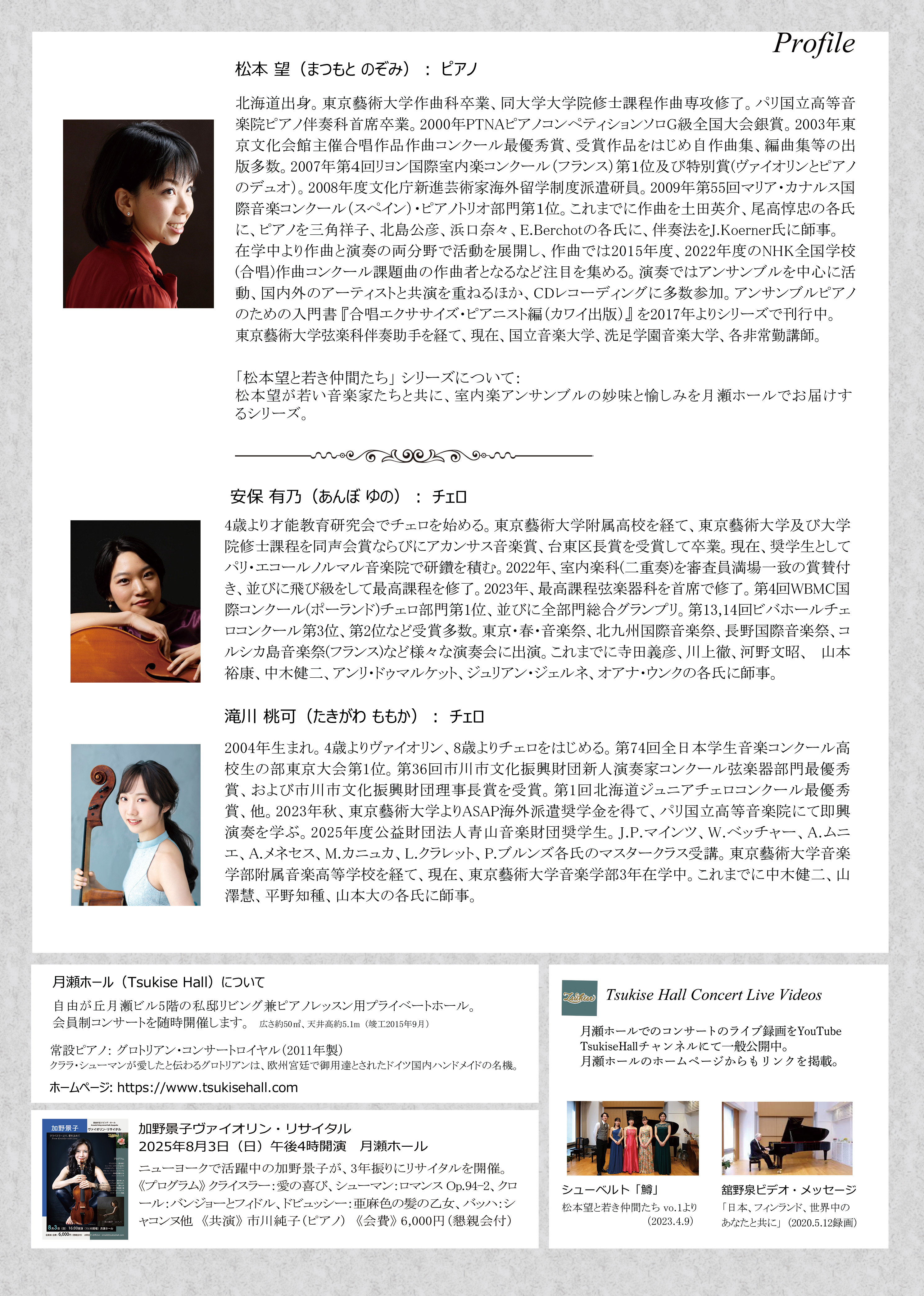 いま注目の作曲家・ピアニストの松本望が、若い音楽家たちと、室内楽の愉しみをお届けするシリーズの第5回。今回は、新進のチェリスト2名との共演です。