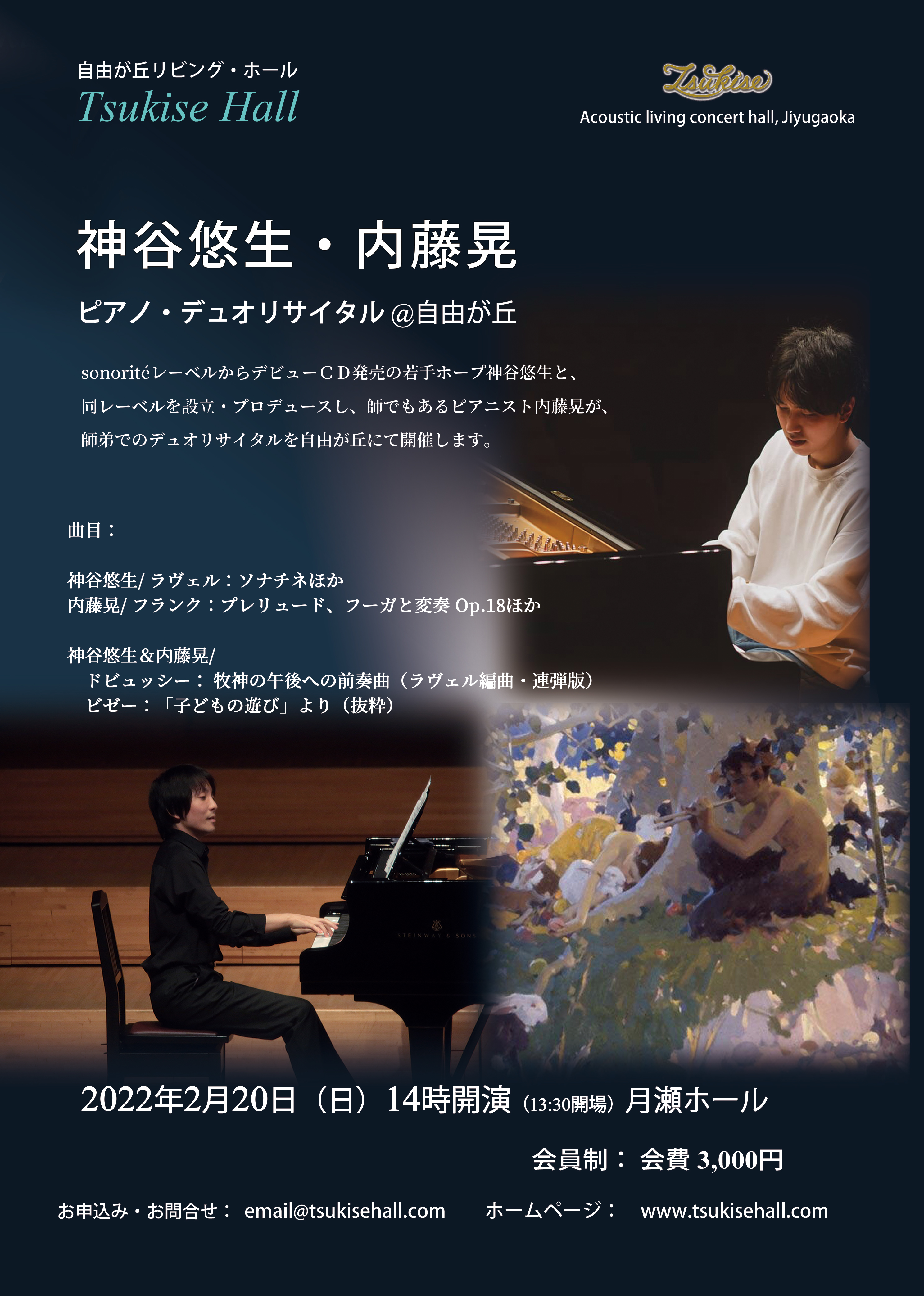 sonoritéレーベルからデビューCD発売の若手ホープ神谷悠生と、同レーベルを設立・プロデュースし、師でもあるピアニスト内藤晃が、師弟でのデュオリサイタルを自由が丘にて開催します。