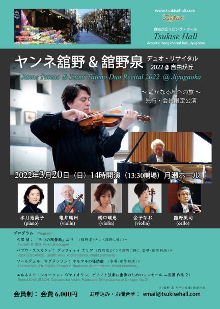 今回のデュオリサイタルは、4月2日東京文化会館小ホールにて開催予定の「ヤンネ舘野ヴァイオリン・リサイタル」の先行・月瀬ホール会員限定公演となります。プログラムは、世界初演曲を含み同一です。また、出演者も同じです。