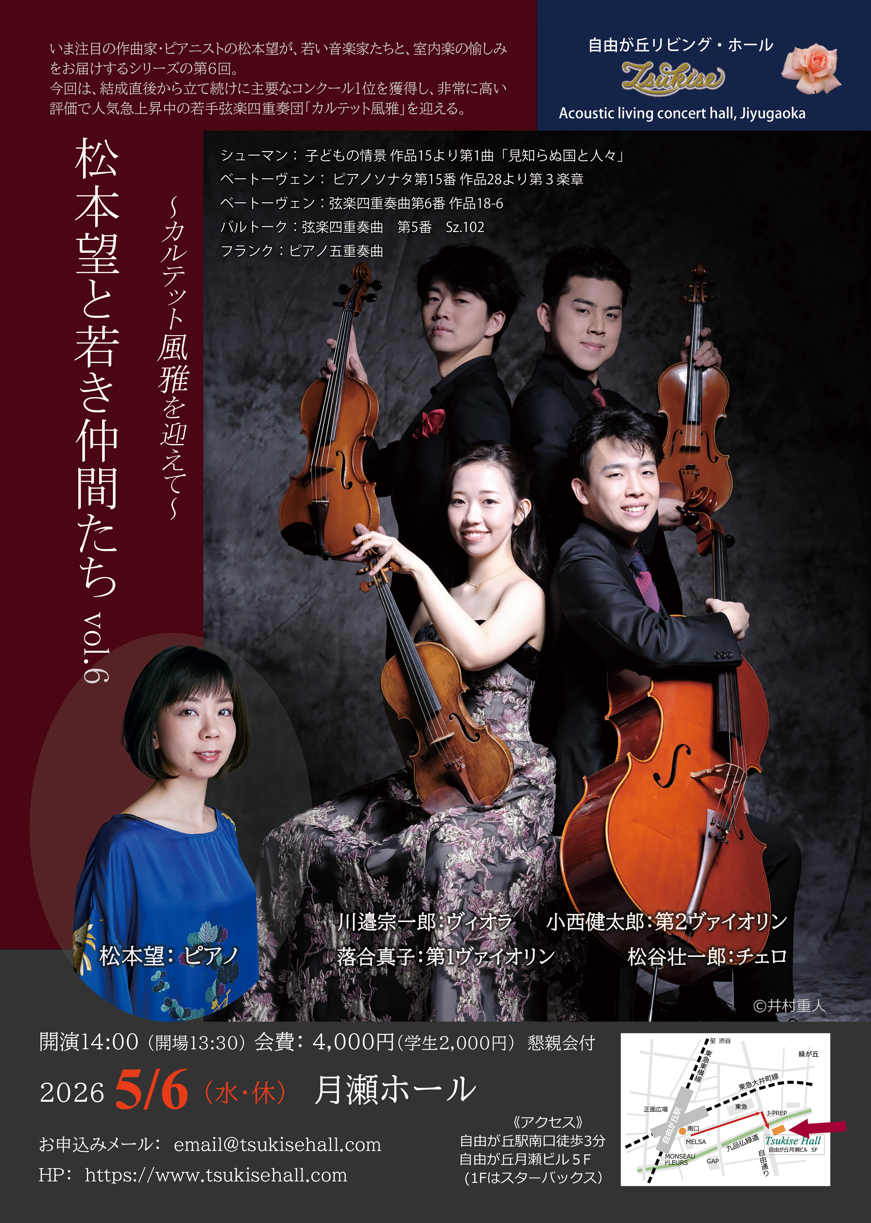 いま注目の作曲家・ピア二スト松本望が、人気急上昇中の若手実力派弦楽四重奏団「カルテット風雅」を迎えて共演します。